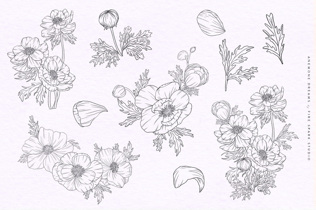 Anemone Dreams is a delicate and detailed collection of botanical line art drawings and beautiful abstract watercolor elements in a range of periwinkle hues.